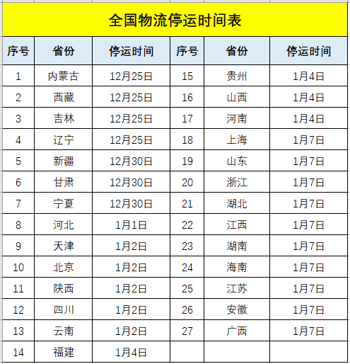 由于天氣寒冷以及霧霾天氣嚴重,今年全國物流停運時間比往年來得早?;趪医煌ú俊⑽锪鞑康炔块T發(fā)出的通知,距離物流停運時間不多了,部分區(qū)域物流將于1月5日開始陸續(xù)放假停運,1月18日將全國大范圍停運。